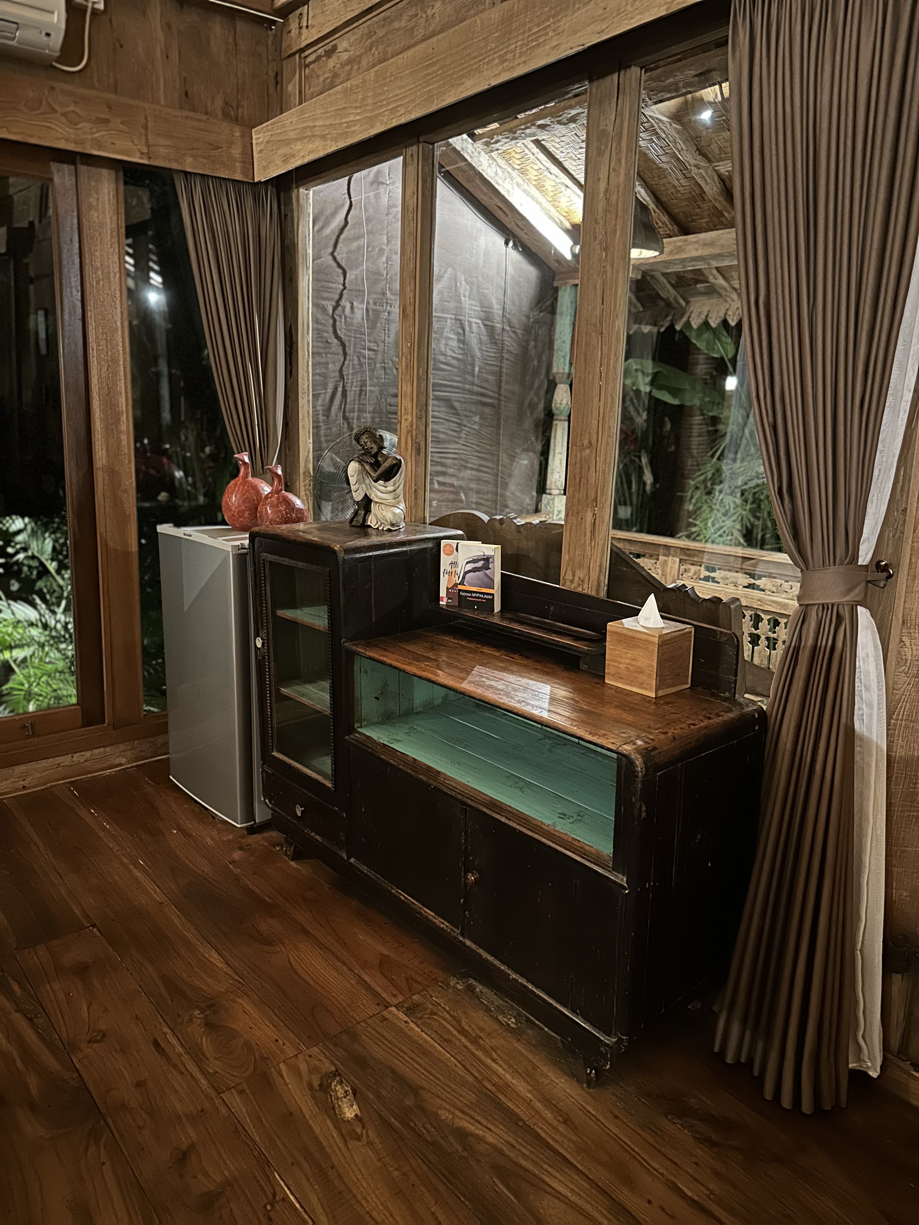 Private bungalow with a private patio, totalling 56 square meters. The bungalow is equipped with 2 bathrooms (hot water showers), a king size bed, a working desk and a fridge.