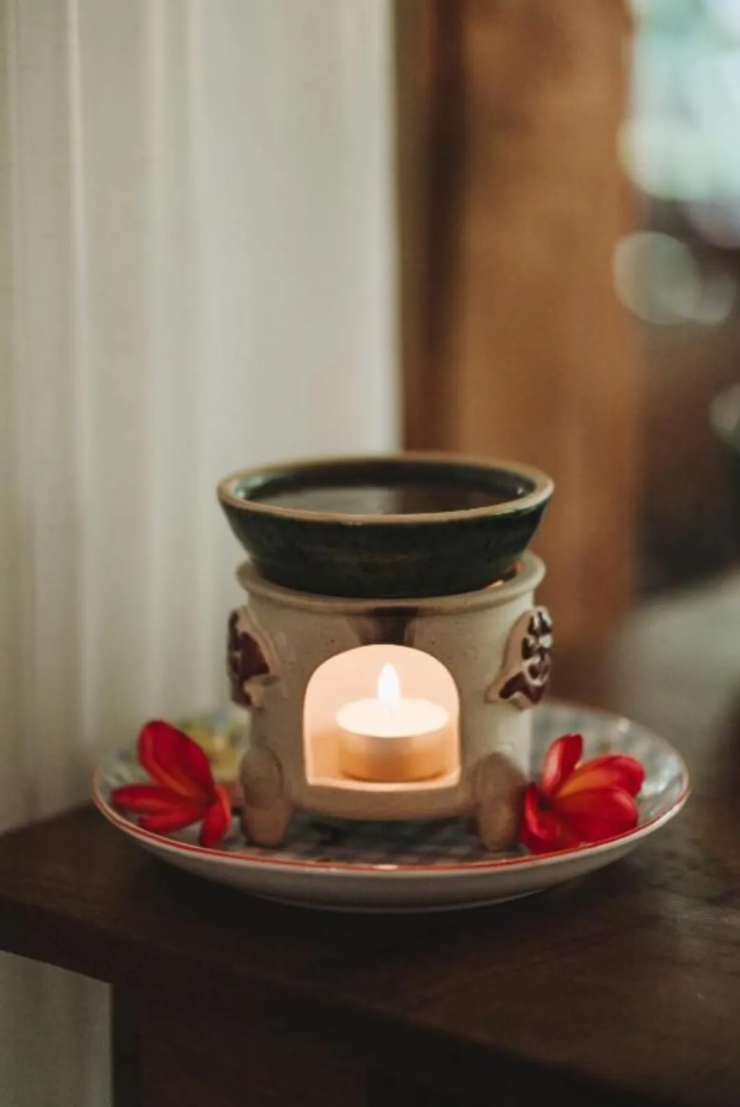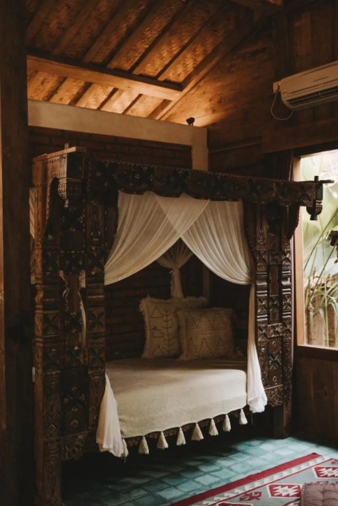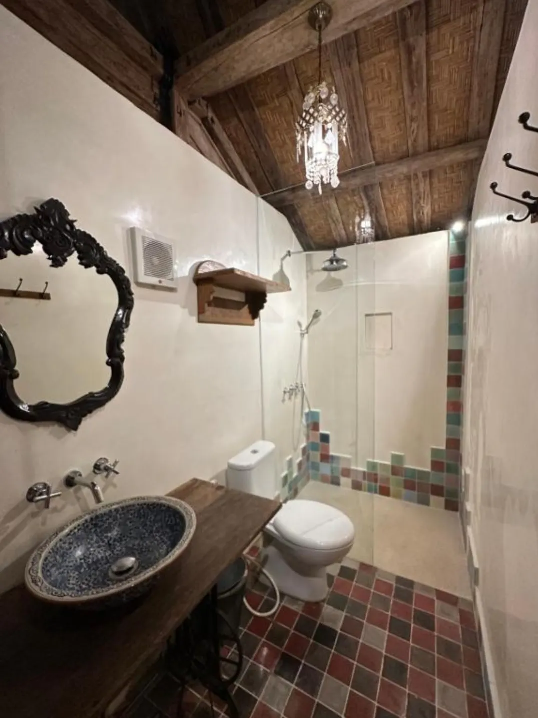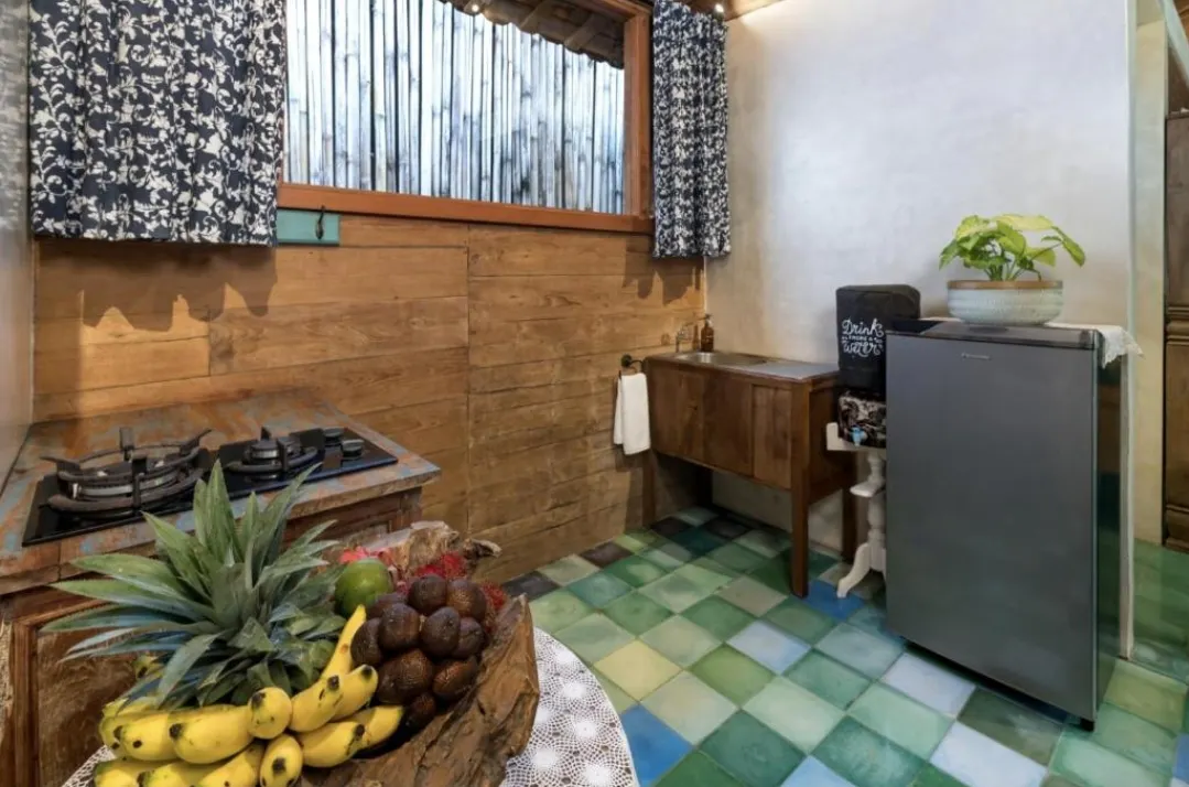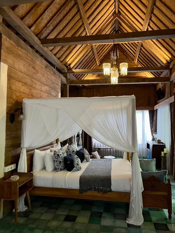 Private bungalow with a patio, totalling 90 square meters. The bungalow is equipped with 2 bathrooms (hot water showers), a kingsize bed, a day bed, a kitchenette, and a working desk.